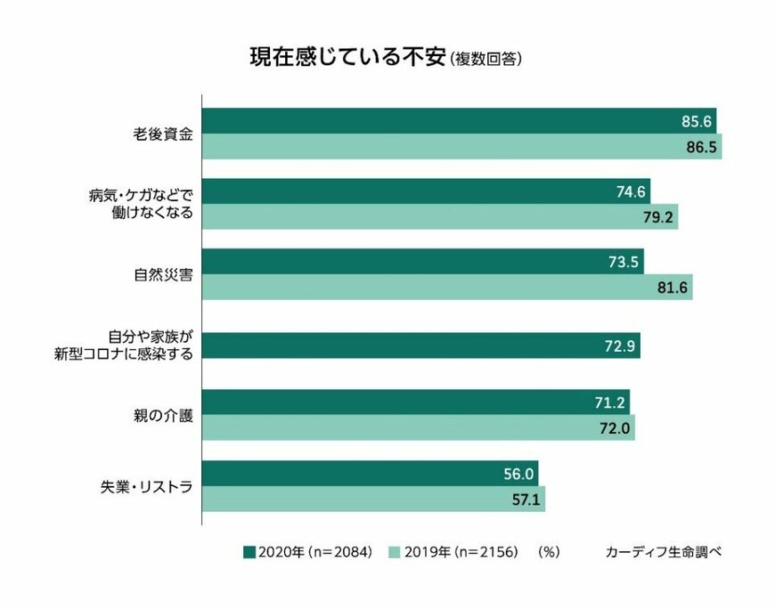カーディフ生命保険㈱が行った「第2回 生活価値観・住まいに関する意識調査」の中で、現在感じている不安について質問したところ、最も多い回答を得たのが「老後資金」でした。2019年と比べると0.9ポイント減少しているものの85.6%の人が不安に感じています。次いで「病気・ケガなどで働けなくなる」が74.6% (2019年比4.6ポイント減)、「自然災害」が73.5%(同8.1ポイント減)となっています。2020年に関しては「コロナへの感染」もあり、72.9%の人が不安に思っていることがわかりました。(複数回答)