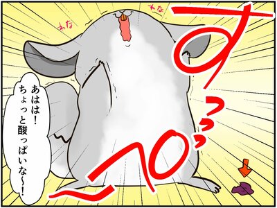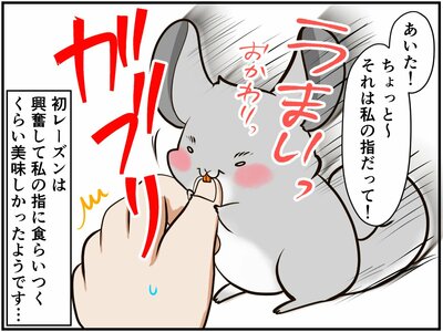 とりあえず、一粒つまんで差し出すと、完全に腰が引けた状態ながらも、あみだちゃんはおずおずと手を差し出します。そして、受け取ったレーズンを一口かじった次の瞬間…。「すっぱい‼‼‼」という表情をしたかと思うと、ワナワナと震えだし、手にもっていたレーズンの残りを床に落としてしまいました。それでも、口の中に酸味が残っているのか、今度はあちこちに飛び跳ねて悶絶するあみだちゃん。