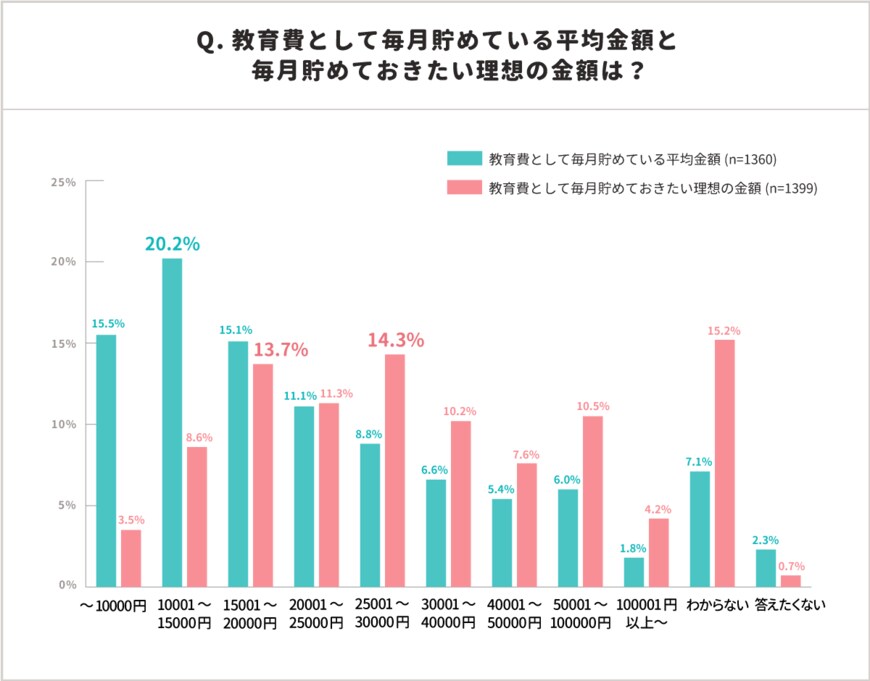 ママたちが子どものために毎月いくら貯金をしているのかというと、「1万1円〜1万5,000円」が最も多く20.2%、次いで「1万円以下」が15.5%、「1万5,001円〜2万円」が15.1%となりました。