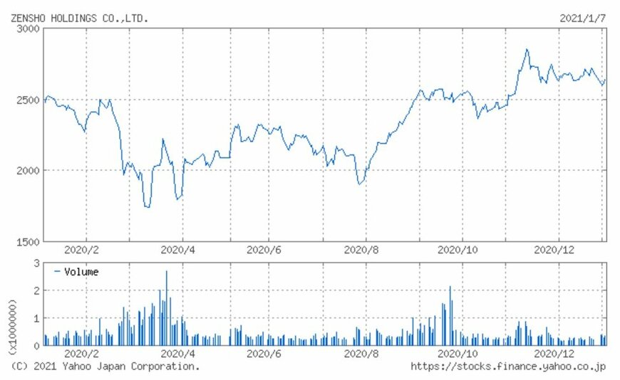 同社の2019年以降の株価は、2,500円台で天井を付ける傾向にありました。2020年も1月に高値2,535円を付けた後に下落を開始。3月には世界的な株価下落を受け1,677円まで下落しました。