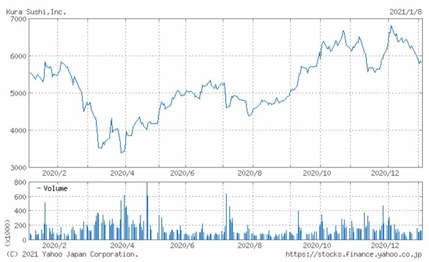 シリーズでお伝えしている「注目小売店月次実績」。今回は回転寿司チェーン店「くら寿司」を運営するくら寿司(2695)の2020年12月の月次動向及び過去実績、また過去1年の株価動向について振り返ってみましょう。