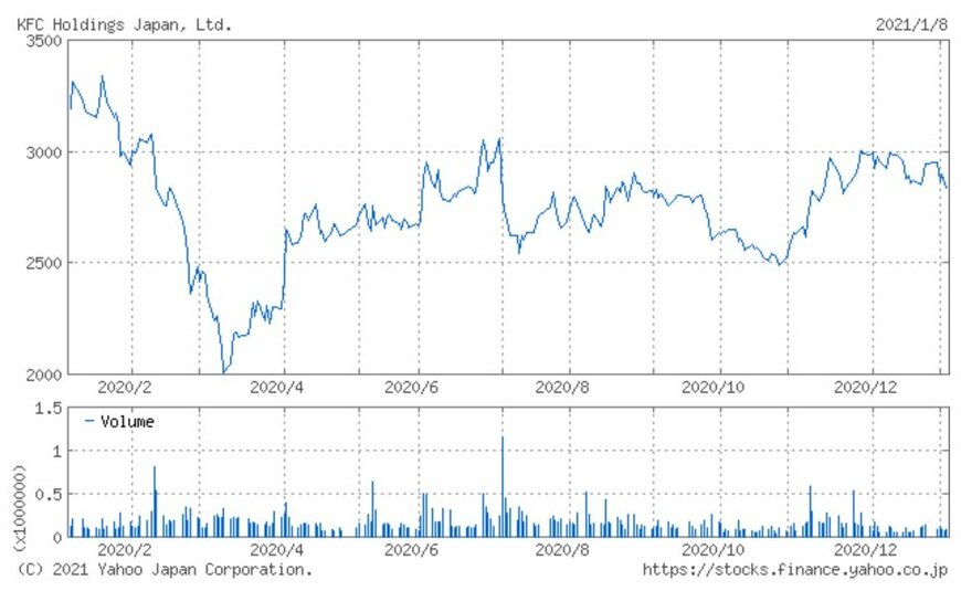 シリーズでお伝えしている「注目小売店月次実績」。今回は「ケンタッキーフライドチキン」を展開する日本KFCホールディングス(9873)の2020年12月の月次動向及び過去実績、また過去1年の株価動向について振り返ってみましょう。
