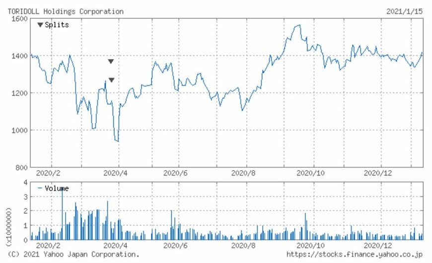 シリーズでお伝えしている「注目小売店月次実績」。今回はセルフ式うどん店「丸亀製麺」他を運営するトリドールHD(3397)の2020年12月の月次動向及び過去実績、また過去1年の株価動向について振り返ってみましょう。