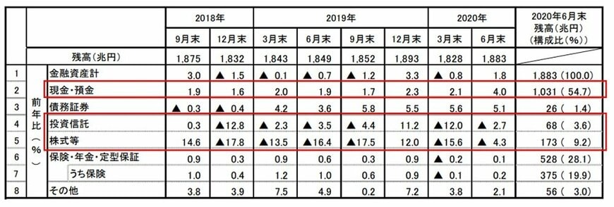 日銀の資金循環(2020年第2四半期)によれば、個人金融資産(総額1883兆円)に占める現預金の比率は約55%と、ゼロ金利にもかかわらず高い比率を維持しています。株式は約9%、投資信託は4%弱でこの傾向は長年変わりません。金額ベースで見る限り、ほとんどの日本人は投資をしていないということになります(図表1)。