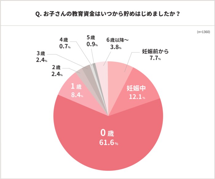 教育資金を貯め始めたのは、出産後すぐのお子さんが0歳の間だと回答したママが61.6%と最も多い結果となりました。