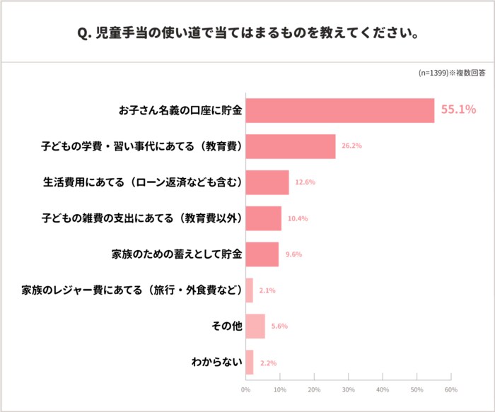 児童手当の使い道としては、「お子さん名義の口座に貯金(55.1%)」が最多でした。その他、「子どもの学費・習い事代にあてる(教育費)(26.2%)」「生活費用にあてる(ローン返済なども含む)(12.6%)」「子どもの雑費の支出にあてる(教育費以外)(10.4%)」という使い道もありました。
