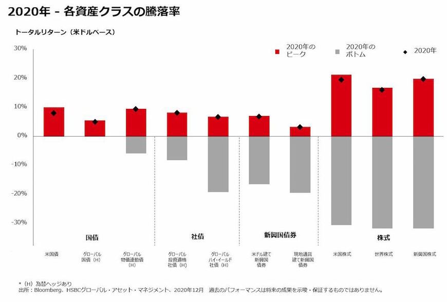 その中で、株式などリスク資産は大きく下落し、コロナショックとも呼ばれる落ち込みとなりましたが、2020年の各資産クラスの騰落率を示したグラフにも示されているように、ほぼすべての資産クラスで2020年はプラスパフォーマンスを記録し、特に、米国株式は21.3%の好パフォーマンスとなりました。