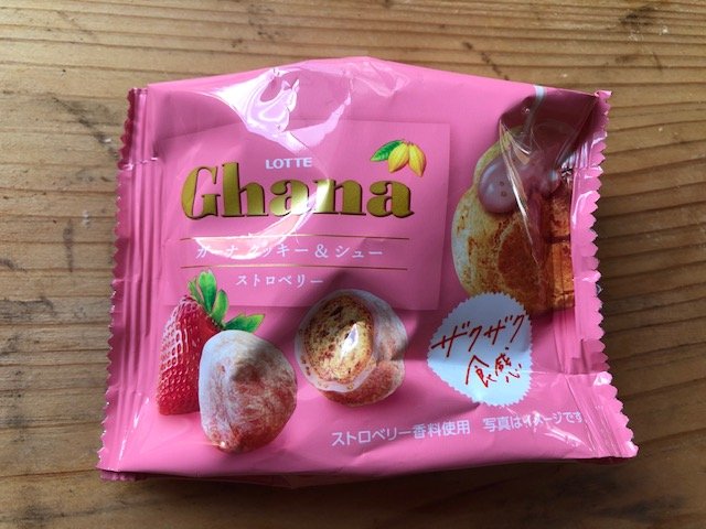ロッテ(LOTTE)の「Ghana(ガーナ)」といえば、板チョコ。そんなイメージが強いせいか、筆者はあまり見かけたことがないのですがシューのような形をした「ガーナ」です。ストロベリーとミルク味があります。お値段は138円(税込149円)。