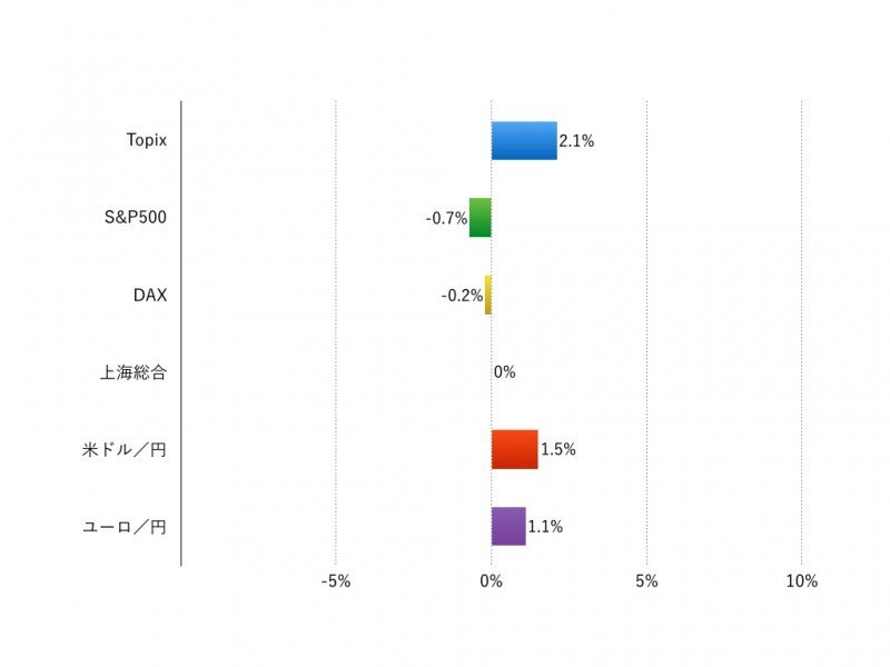 先週(10月3日‐10月7日)の世界の株式市場は欧米株が下落し、日本と新興国株が堅調でした。週間騰落率はTOPIXが+2.1%、S&P500が▲0.7%、DAXは▲0.2%でした(中国は国慶節で休場)。