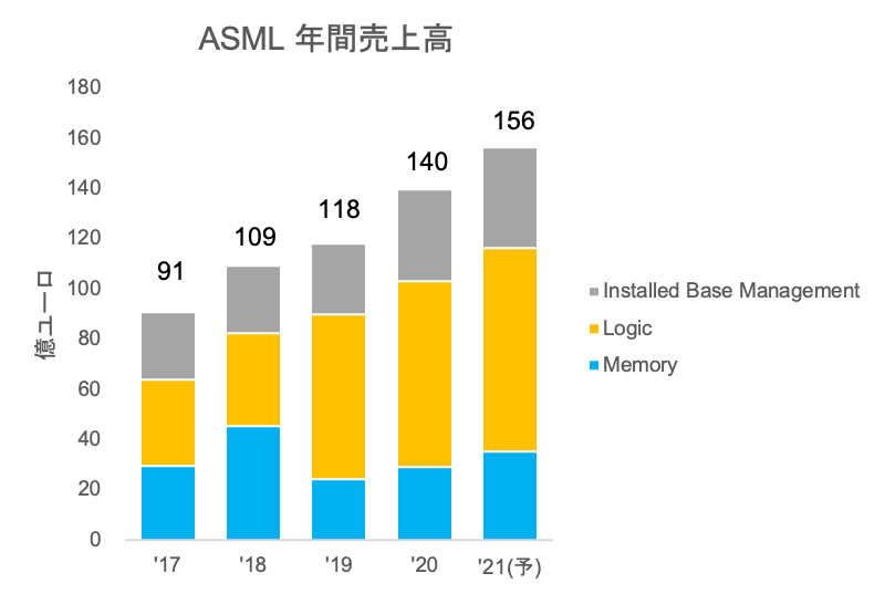 半導体露光装置大手のオランダASMLは2021年通年の売上高見通しとして、前年比で2桁成長を見込んでいる。メモリー、ロジック向け双方で売り上げ増を見込むほか、EUV関連の売上高も前年比3割増を計画する。同社によれば、ロジックが前年比10%増、メモリーが同20%増、インストールベース事業が同10%増を計画。これに基づくと21年売上高は156億ユーロ規模となり、前年比12%増の2桁増となる見込み。EUVも金額ベースで58億ユーロを計画する。なお、具体的な販売台数見通しの開示はなかった。