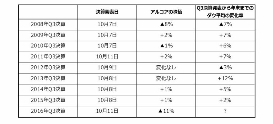 興味深いことに、今年10月11日のアルコア株の下落率は2008年からの9年間で最悪なもので、リーマンショックがあった2008年のQ3決算当日の下落率を上回るものでした。また、その2008年の年末までのダウ平均の下落率が▲7%であったという事実も気になるところです。