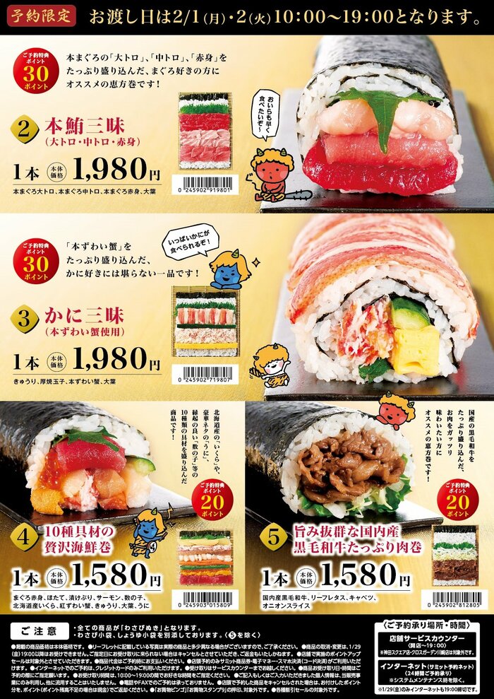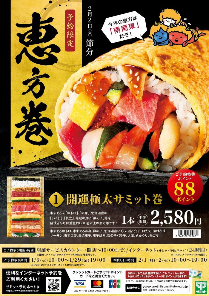 サミットでは、毎年魅力的な恵方巻を用意しているそう。1本1本店舗で手作りしているため、作りたてのおいしい恵方巻が楽しめます。今回は総重量なんと800gの「開運極太サミット巻」をはじめとする5種類がラインナップ。こちらは予約限定商品となっており、1月29日(金)19時が予約の締め切りとのことなので、気になる方はお早めにご予約を。商品の受け取りは2021年2月1日から2月2日の間です。