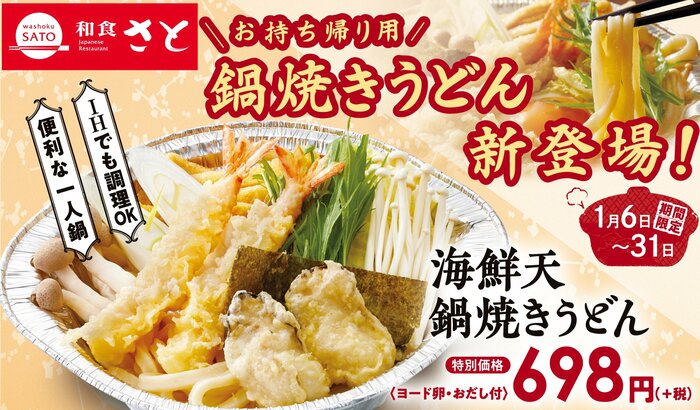 そんなときにぴったりなのが今回のテイクアウトキャンペーンです。和食さとでは1月6日から1月31日までの期間限定で「鍋焼きうどん」をテイクアウトメニューとして販売しています。