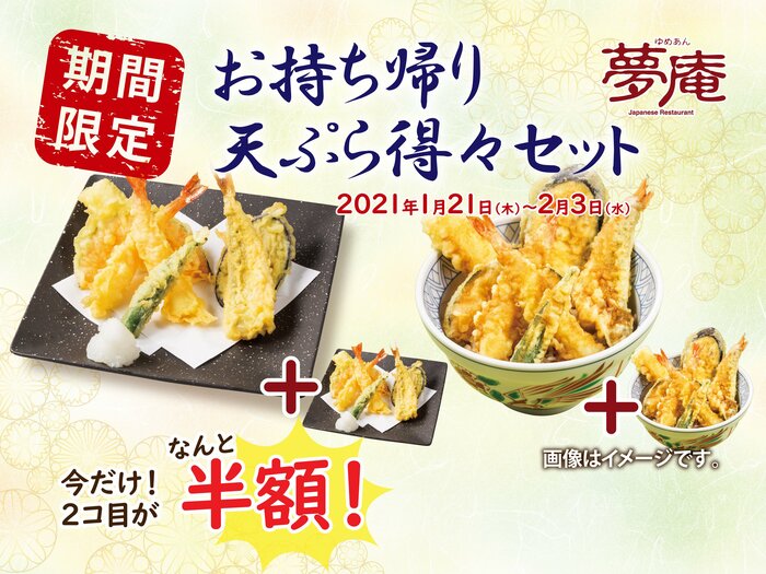 ・対象メニュー:以下の天ぷらメニューが2個目は半額になります。