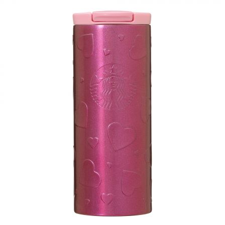 鮮やかなピンクのボディ全面にハートのエンボスを施したステンレスタンブラーです。キラキラ光るラメがさらに華やかな印象を与えます。真空二重構造ステンレスで保温・保冷機能に優れているそう。好きなドリンク1杯を無料で楽しめるチケットが付きです。