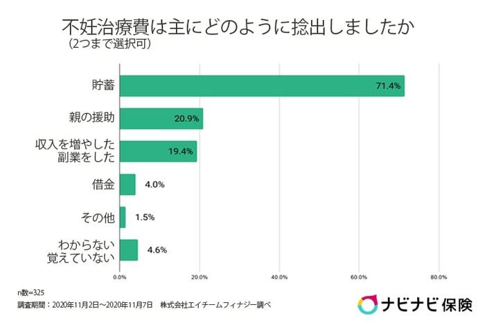 次に、「不妊治療費をどのように捻出しましたか?」という質問をしたところ、「貯蓄(71.4%)」が最多で、「親の援助(20.9%)」、「収入を増やした・副業した(19.4%)」と続きます。