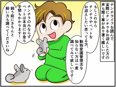 漫画家の祭さんは、おみくじちゃんとあみだちゃんというチンチラの母子、そしてデグーの棟梁ちゃんというネズミさんたちと一緒に生活しています。そんな中に、年明けに急遽仲間入りした保護チンチラの福くん。