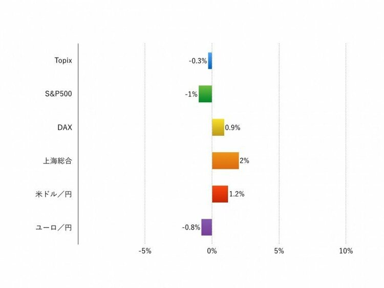 先週(10月10日‐10月14日)の世界の株式市場はまちまちでした。週間騰落率はTOPIXが▲0.3%、米S&P500が▲1.0%、独DAXが+0.9%、上海総合が+2.0%でした。