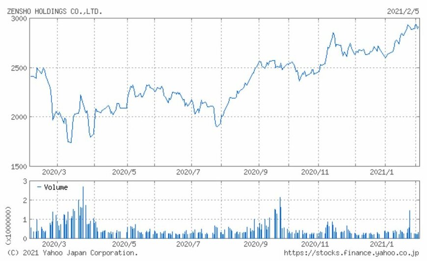 同社の2019年以降の株価は、2,500円台でいったん天井を付ける傾向にありました。しかし昨年11月の上昇を受けて、2,500円台を上方ブレイクして2,800円台まで上昇しています。その後は2,600円台まで後退したものの、2021年に入り再度上昇を開始し、現在は3,000円目前の水準で取引されています。