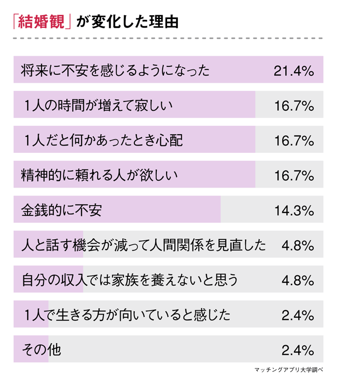 結婚観が変わった理由として最も多かったのが「将来に不安を感じるようになった(21.4%)」です。続いて、「1人の時間が増えて寂しい(16.7%)」「1人だと何かあったとき心配(16.7%)」という結果になっています。孤独感や寂しさが結婚願望を強めました。