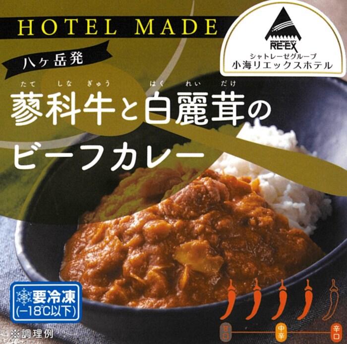 ブランド牛「信州蓼科牛」のやわらかいお肉の食感と、陸のアワビといわれその独特の歯ごたえが特徴である信州小海町産「白麗茸」の食感が楽しめる辛口カレーです。