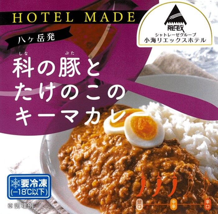 保水性が高くやわらかい肉質が特徴の「科の豚」を超あらびきにしたものと、国産のたけのこの食感をアクセントにしたインドカレー仕立ての中辛カレーです。