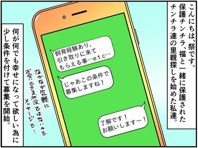 福くんと一緒に保護された子たちの里親探しを始めた祭さん(84話参照)。チンチラ仲間さんの尽力によって、すぐに新しい飼い主さんが見つかり、ほっと胸をなでおろしますが…。