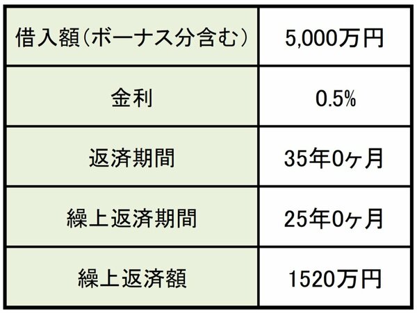 たとえば、借り入れ5,000万円、金利0.5%で35年返済ローンを組んでいるとして、25年後に退職金1,520万円で全額繰り上げ返済したらどうなるでしょうか?