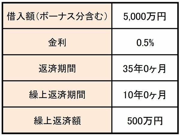 先ほどと同様、借り入れ5,000万円のケースで期間35年、変動金利で0.5%、10年後に500万円を繰り上げ返済したケースをシミュレーションしてみましょう。