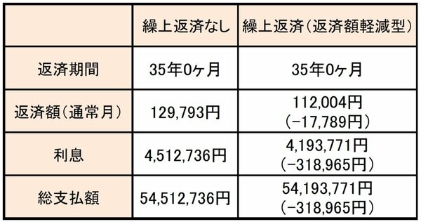 すると、返済額低減型の場合は月々のローン負担が17,789円減少し、金利の総支払額は31万8,965円ほど少なくなります。