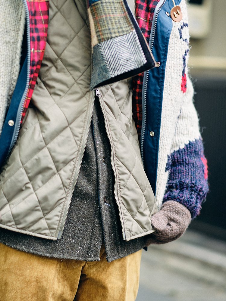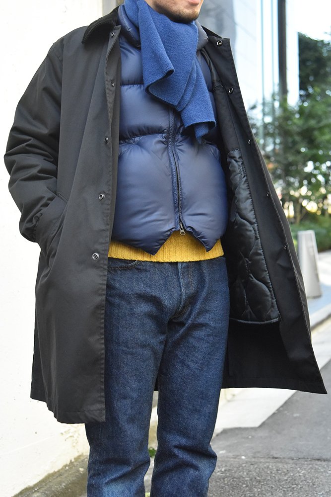 前面の裾の形がジレのようになっているので、中間着としても取り入れやすいんです。同ブランドだと、他にイタリアンベストというモデルもありますが、こちらはよりインナーダウン的な立ち位置。サイズ感もコンパクトなので、アウターを羽織った時もスタイリッシュです。