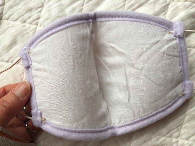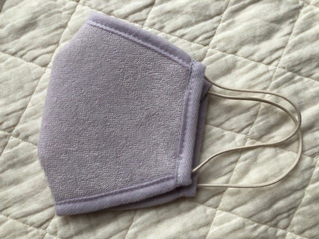 先ほど紹介した『抗菌 洗えてくり返し使える ニットマスク』は裏地がメッシュでしたが、こちらはガーゼを使っています。そして薄いスポンジのような素材が入っているためか(触ると、パフパフします)、息をするとマスクの内側の湿度が上がる感じがしました。5分つけているだけで、口元がかなりしっとりします。表地は綿100%です。