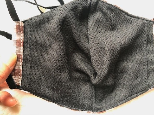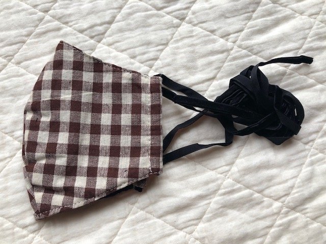 青、茶色、黒のチェック柄です。裏地は『抗菌 洗えてくり返し使える ニットマスク』同様に抗菌メッシュ素材。耳にかける部分は伸縮性のないリボンなので、自分で長さを調整して結ぶ必要があります。そして耳にかけた時にジャストフィットさせる長さにすると、耳にかけるまでの作業がちょっとてこずります。伸びないので、グッと引っ張る必要があるからです。もっと使いやすくするために、ゴムに変えるのもいいかもしれません。