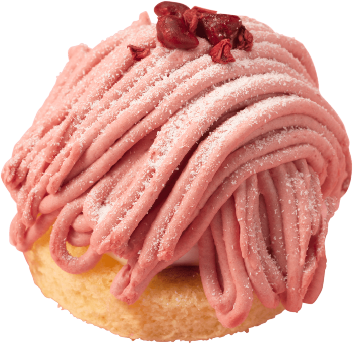 昨年登場して大好評だった商品の復活です。目を引く鮮やかなピンクのモンブランクリームは「福岡県産あまおう苺」の果汁を使用して甘酸っぱく軽やかな甘みに仕上げられています。中は北海道産マスカルポーネクリームの爽やかでミルキーな味わいになっているとのこと。さらに、2種類のクリームの間にあまおう苺のソースをサンドするという、あまおう苺を堪能できる見た目も可愛いモンブランになっています。