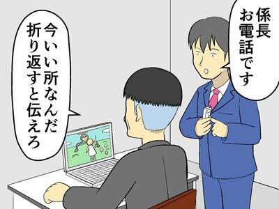 ゲームでサボリ中の上司に取引先からの電話を取り次ごうとしたところ、「今忙しい」と出るのを拒否。しかも、折り返しの電話では、こともあろうに「部下のせいで電話にででられなかった。」と言い訳まで。聞いていた部下はとにかくモヤモヤ…。