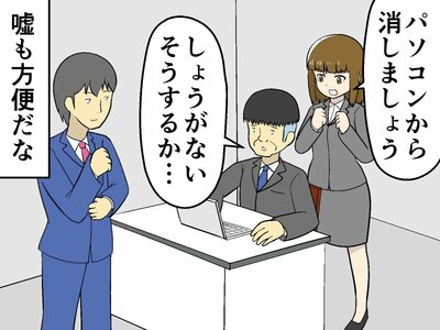 なのに、折り返しの電話では「いやー、先ほどはすみません。部下がやらかしまして…。」と、さらに大ウソ。「ええ⁈俺のせい?」思わず眉をひそめる主人公に、係長は「ん?なんだ、その目は?『嘘も方便』っていうだろう?」と、さも当然とばかりに開き直ります。