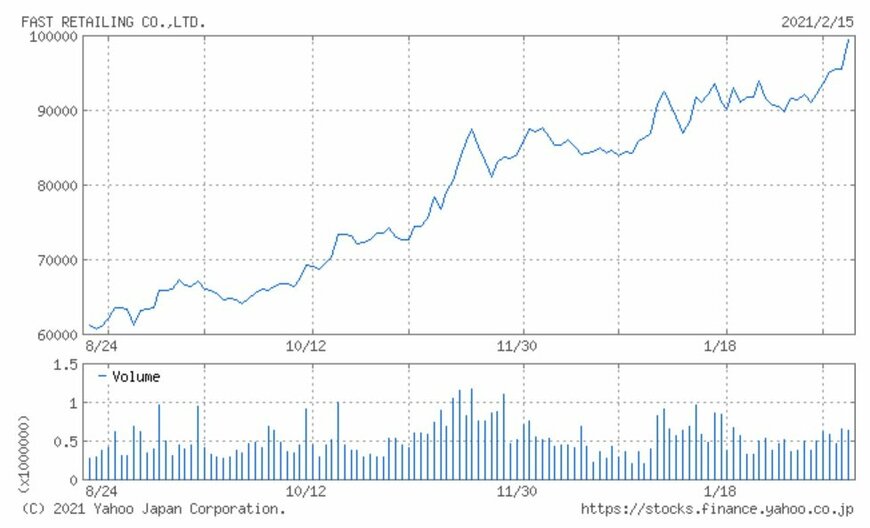 株価指数寄与度の高い値嵩株が買われ、とりわけ、ファーストリテイリングは+4%超高へ急騰し、株価10万円が目前となりました。