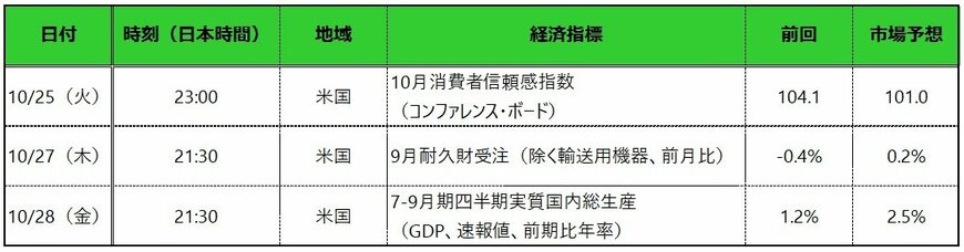 今回、10月の同指標の市場予想は+101.0と、前月を若干下回る水準となっているものの、依然として高水準の見通しとなっています。特に、労働市場への楽観的見方が強まっていることから、米国経済は引き続き堅調に推移していくと考えられます。
