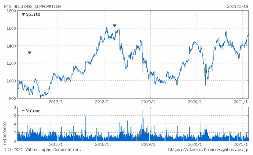 2019年後半に持ち直し、2020年2月には1400円台まで回復しますが、コロナの影響で3月には1000円を割るところまで急落。以降は好調な業績に支えられ、8月には1600円目前まで上昇しました。その後いったん1200円台まで落ち込みましたが、再度上昇し2月は1500円前後で推移しています。