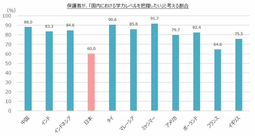 日本は60.0%と低い結果でしたが、2番目に低いフランス(64.6%)を除いた他の国々では75%以上の保護者が「我が子の国内での学力レベルがどの程度ものか」と関心を寄せています。