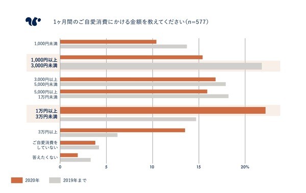 図1のように、コロナ禍以前は1ヵ月間の「ご自愛消費」にかける金額として、最も大きな割合を占めていたのは「1,000円以上3,000円未満(22%)」でしたが、コロナ後の2020年には15%までに減少しています。