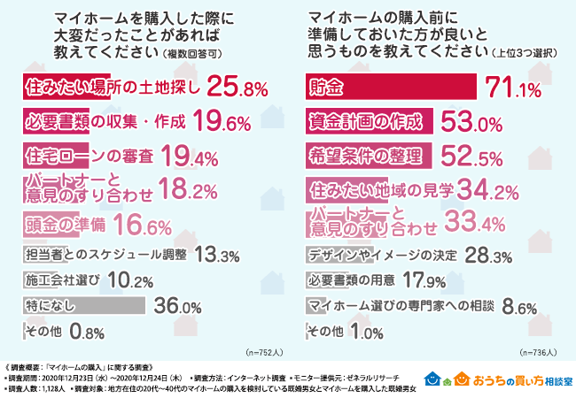 また、「マイホームの購入前に準備しておいたほうがよいと思うものを教えてください(上位3つを選択)」という質問には、7割以上が「貯金」と答えました。先ほどの質問である、大変だったこと5位の「頭金の準備」とも関係してきます。