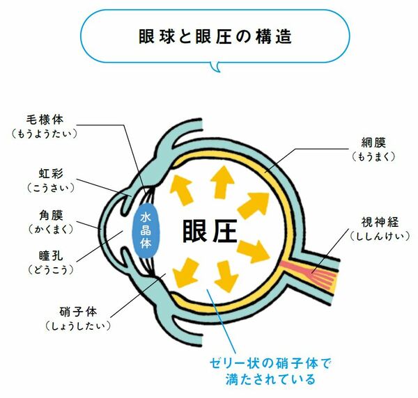 じつはシュッというあの風で、「眼圧」を測定しているのです。この眼圧が正常だからこそ、眼球がフニャフニャになることなく、見る物が歪んで見えないのです。