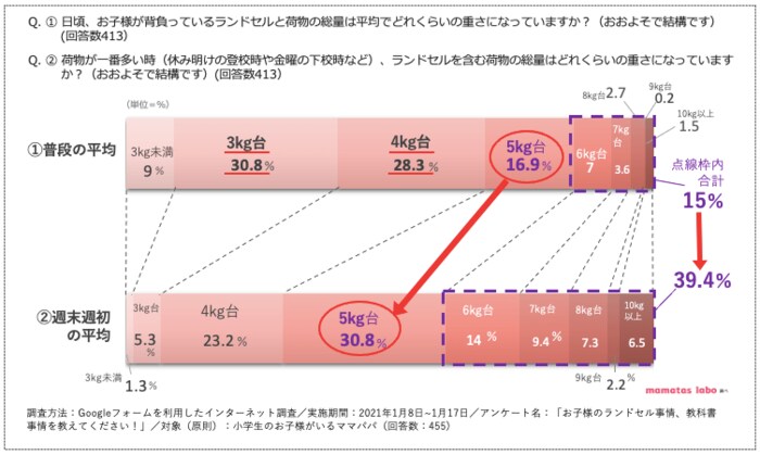 小学生のランドセルの重さは、3~5キロほどあるのもおかしくないというのです。さらに、週末週初になると荷物は一気に増量し、5キロ台は16.9%→30.8%に増加します。6キロ以上にいたっては15%→39.4%と2倍以上に増加して、全体の約4割を占めるのです。