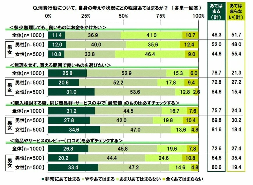消費意識・行動についての考え方や状況にそれぞれどの程度あてはまるか聞いたところ、<多少無理しても、良いものにお金をかけたい>では「非常にあてはまる」は11.4%、「ややあてはまる」は36.9%で、合計した『あてはまる(計)』は 48.3%という結果です。