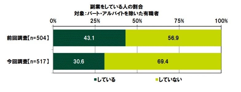 前回の調査(2019年12月調査)では、副業をしている人の割合が43.1%でしたが、今回の調査では大幅な減少となりました。新型コロナウイルス感染症(COVID-19)の影響で副業も休業せざるを得なくなったことが考えられます。