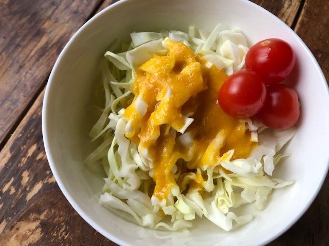 カルディには様々なドレッシングが売っているのですが、得に人気なのが『野菜がいっぱい にんじんドレッシング 』です。キャベツとの相性がいいなと感じます。千切りしたキャベツにドレッシングをかける。でもすぐには食べません。数分おいてキャベツがドレッシングでしんなりしてきたら食すのです。