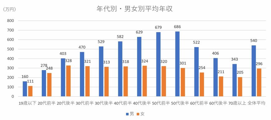 まず最初に、年代別、男女別の平均年収を見てみましょう。国税庁の民間給与実態統計調査を用いて表にしました。