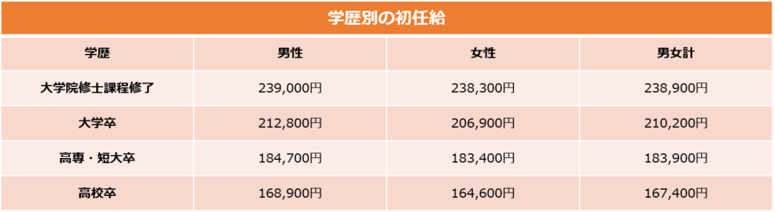 厚生労働省の賃金構造基本統計調査から学歴別の初任給を見てみましょう。