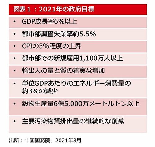 李克強首相は毎年恒例の「政府活動報告」を発表し、困難な1年を乗り切ってきた政府の成果を再確認するとともに、2021年に達成すべき具体的な経済目標を提示した。中でも重要な項目は、GDP成長率6%以上、都市部調査失業率約5.5%、消費者物価指数(CPI)の3%程度の上昇、そして都市部での新規雇用1,100万人以上である。